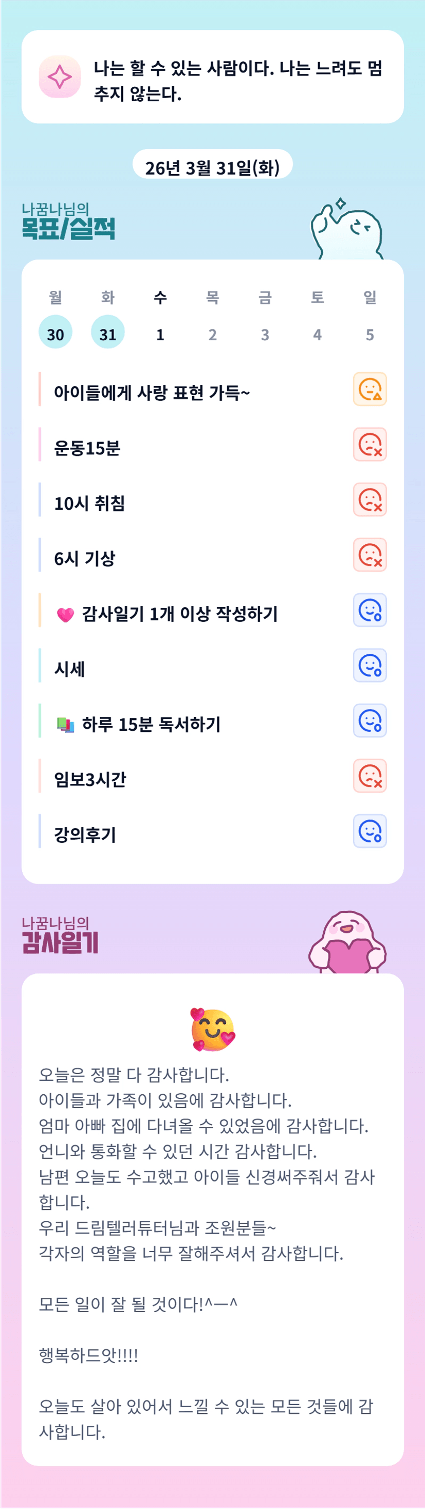 모든것에 행복과 감사해 하시는 조장님께서 이끌어 주셔서 우리조 이번달 행복할 것 같아요ㅎㅎ😄💕