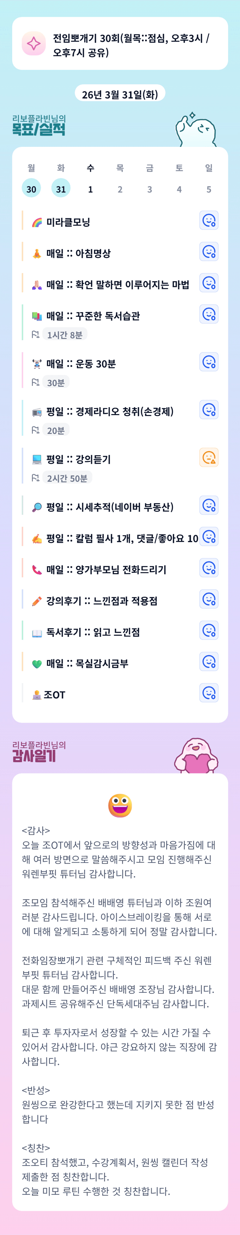 감사함과 칭찬이 가득한 하루를 보내셨네요! 함께 배움으로 꽉찬 한달 만들어봐요! :)