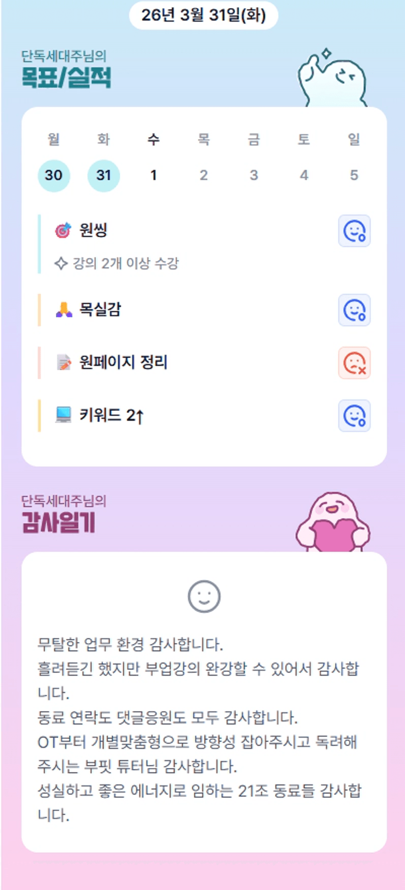 한 달 동안 함께 뽜이팅해요!! 잘 부탁드리겠습니다 :)