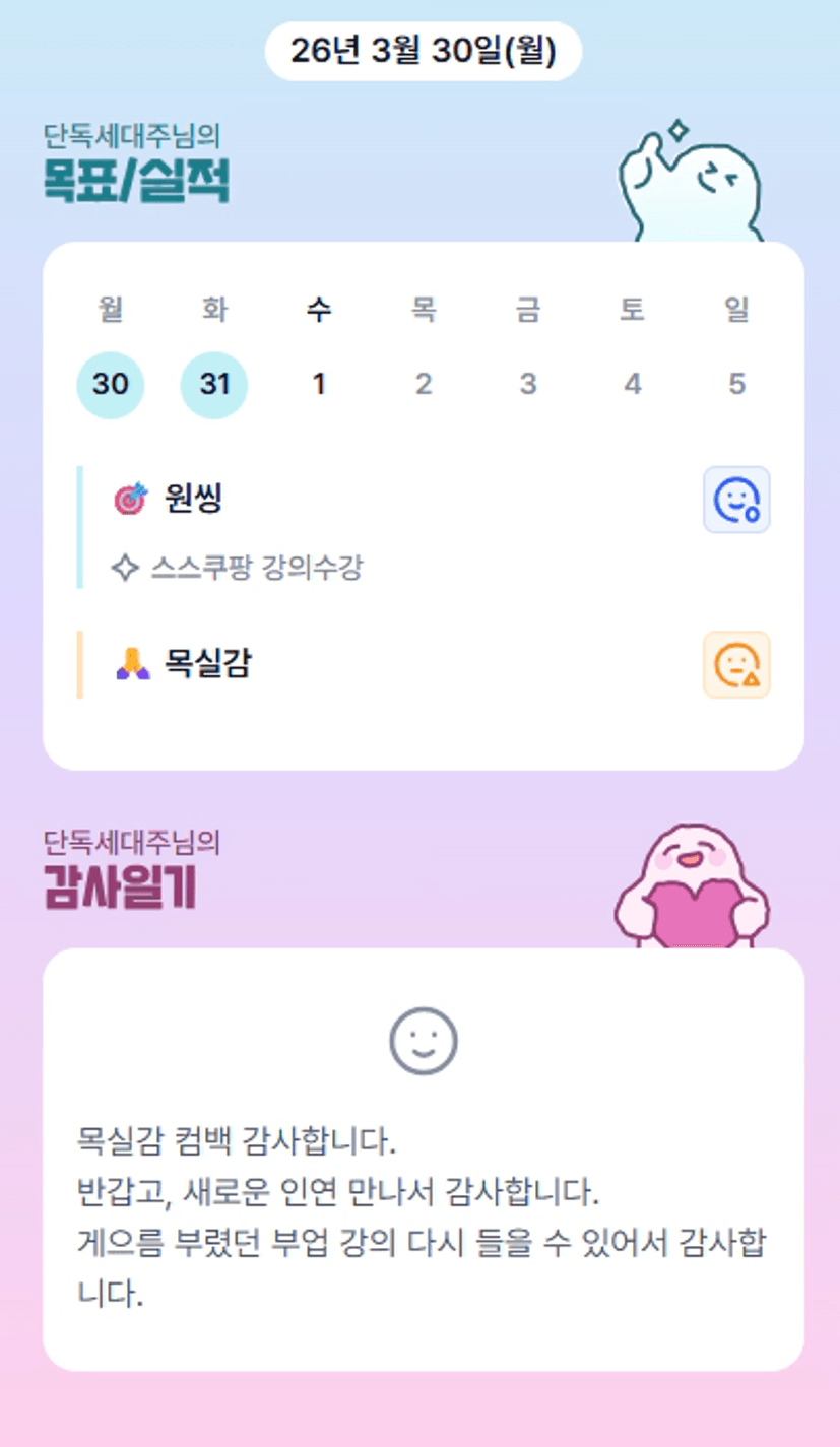 세대주님! 목실감 컴백 환영합니다. 한달 잘 부탁드려요~~^^