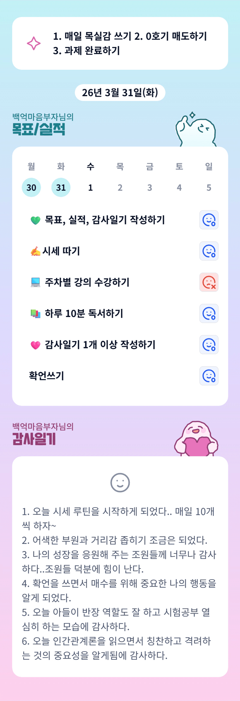 백억부자님 루틴추가 응원합니다!! 부원분과 발전이 있으셨군요 ㅎㅎ 이번달 같이 열심히 해보시죠~~