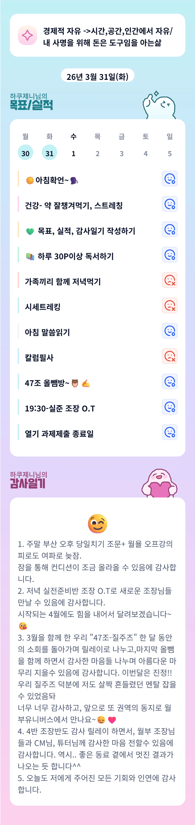오프강의 잘 다녀오셨나요?? 부산과 다음날 오프강의까지 엄청난 시간들을 보내셨네요. 컨디션 회복되셨다고하니 다행이예요~~4월도 열심히 달리실 제니님!! 응원합니다~~~ 건강 챙기는 한달 되세요~~