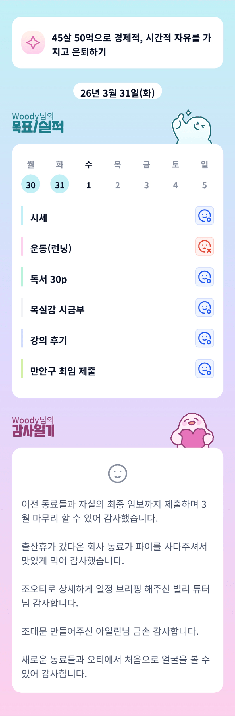 바쁘지만 알차게 보내신 우디조장님!! 이번 한달도 응원합니다 화이팅💪🏻