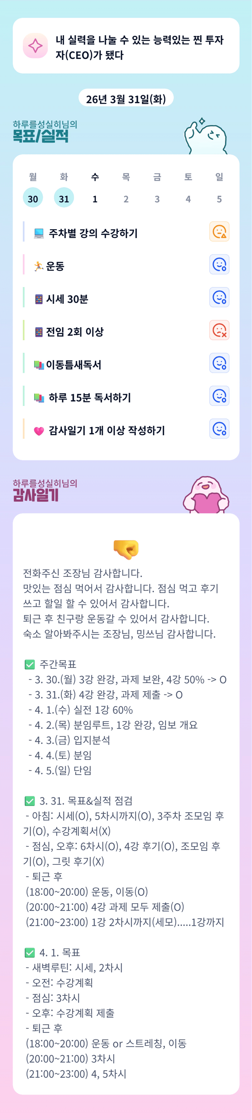 우와! 하루님 목실감 엄청 자시헤 적어주셨네요~~ 이렇게 해야 달성률을 높일 수 있는거군요! 한달동안 잘 부탁드립니다,!!~
