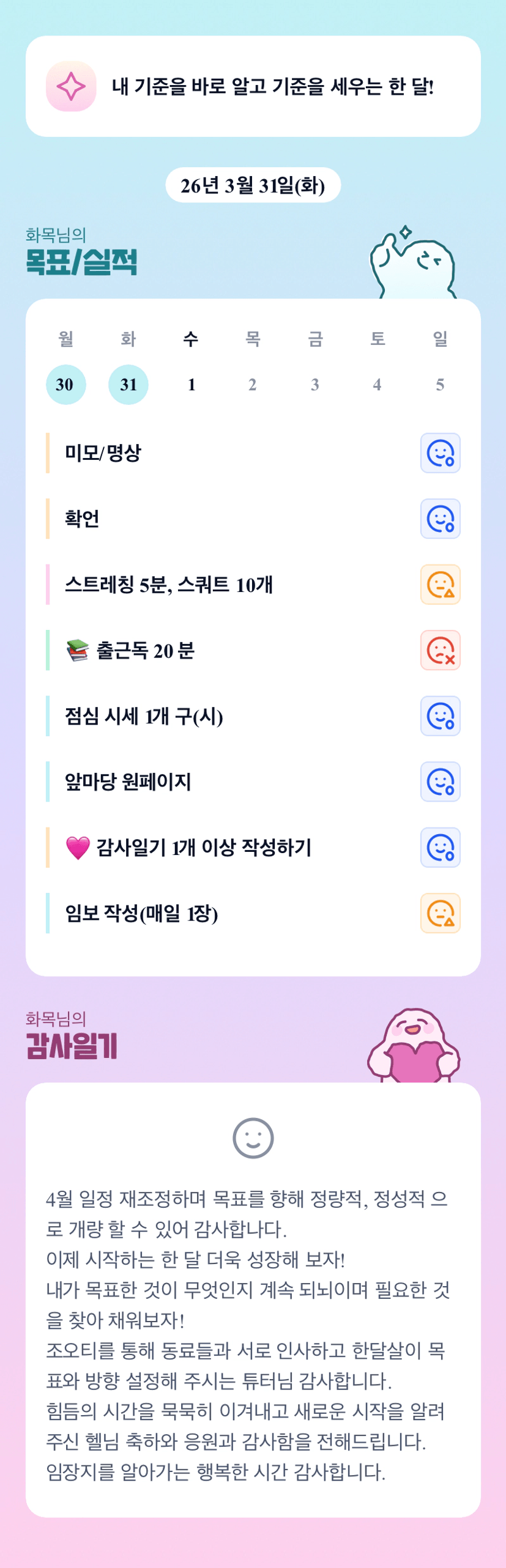 화목님 ! 오티때 봬 정말 반갑습니다! 이번 한 달 간 잘 부탁드립니다 :) 오늘도 파이팅하세용