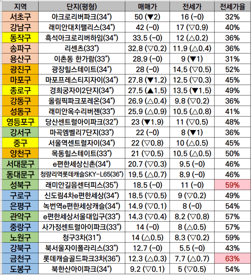 서울 중에서도 강남구, 서초구, 송파구, 마포구 등