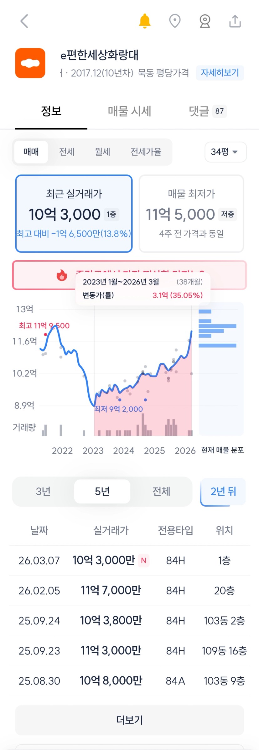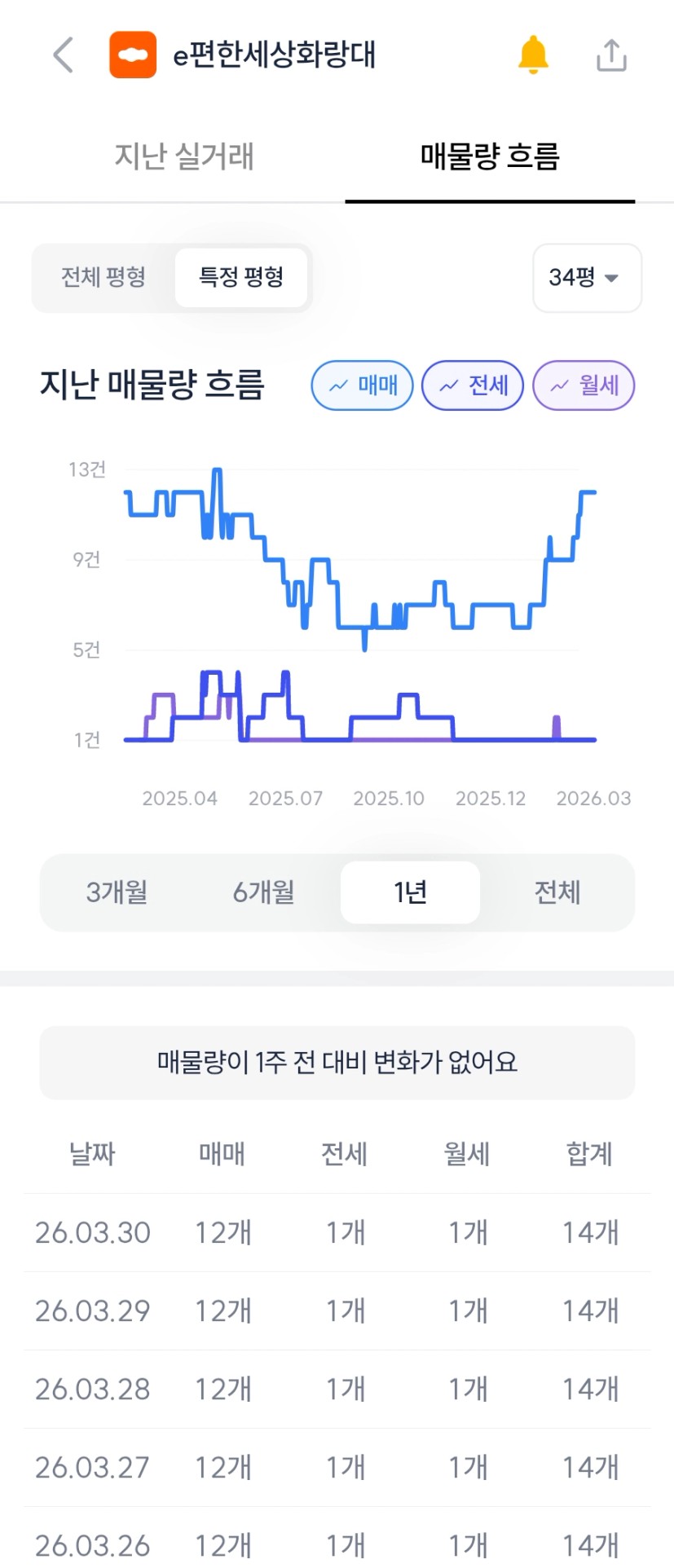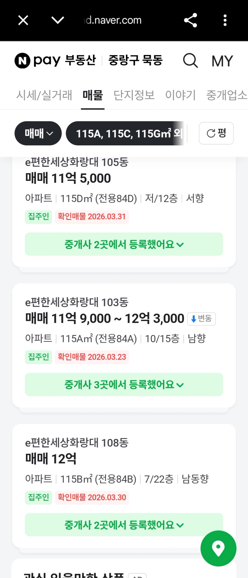 사가정 대장은 물량이 소폭 주는데, 한신과 e편한세상화랑대는 물량이 아직 는는 추세