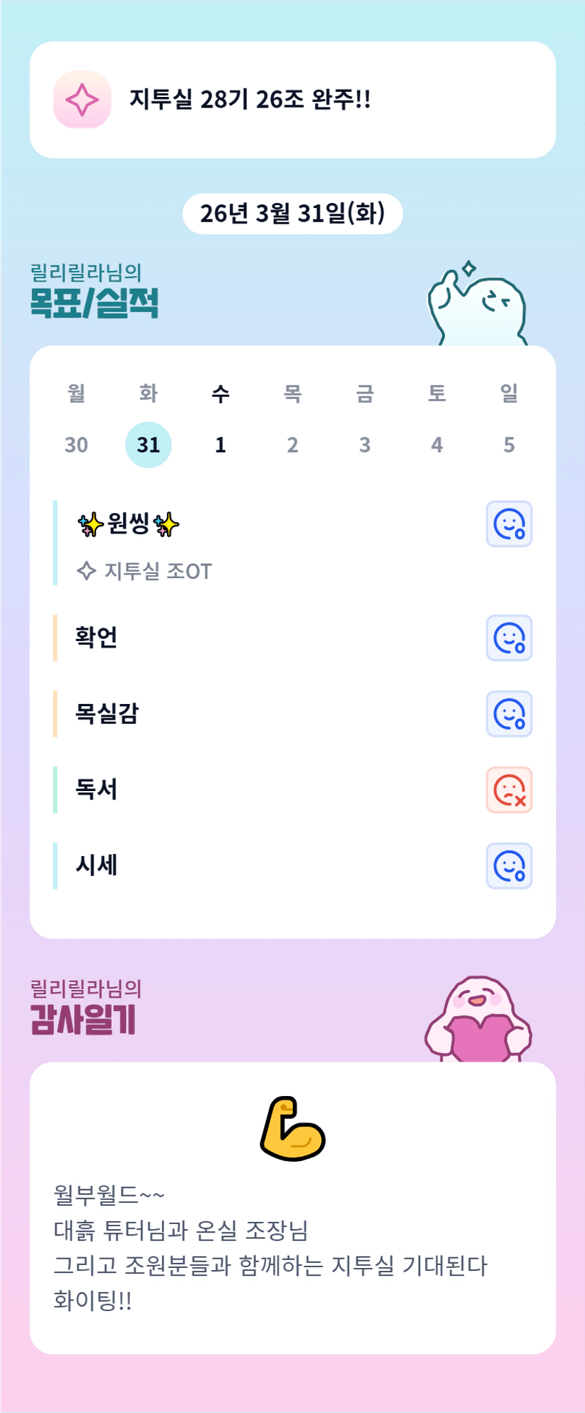 저 온실속의 화초인가요 ㅋㅋ 한달간 화이팅입니다 릴라님!