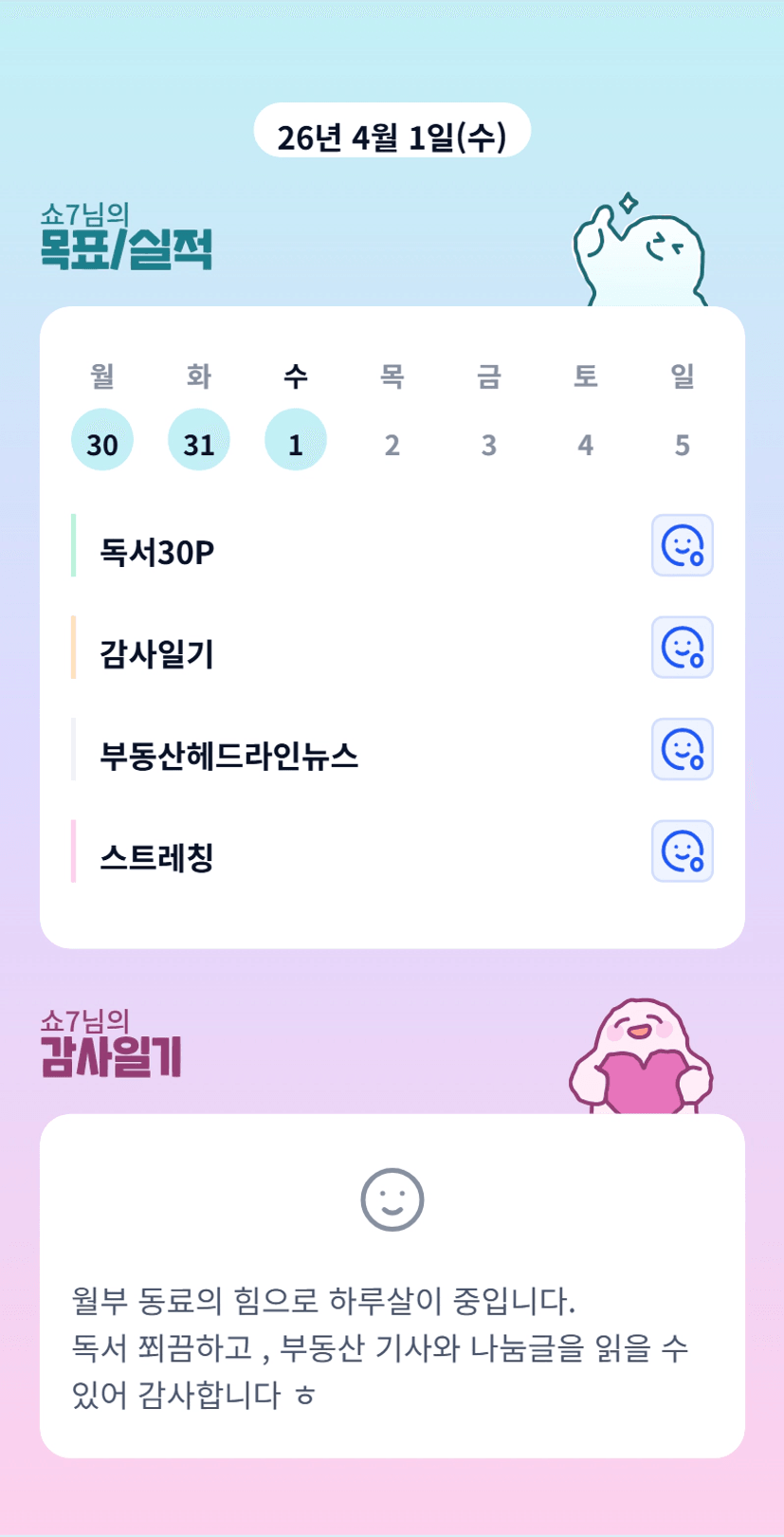 홧팅 홧팅...울 쇼님 넘나 잘하고 있다~~~~~~아주 작은 습관이 쌓여서 결국 목표까지 이룰 수 있게 해주는 그날까지 멱살잡고 갑시당
