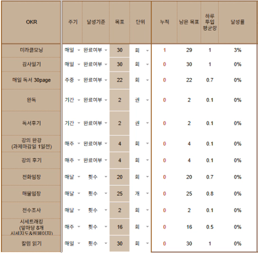 - 목표 : 전수조사 2회, 매일 밤 자기 전 30분 시세 루틴 16회, 칼럼 읽기 30회
