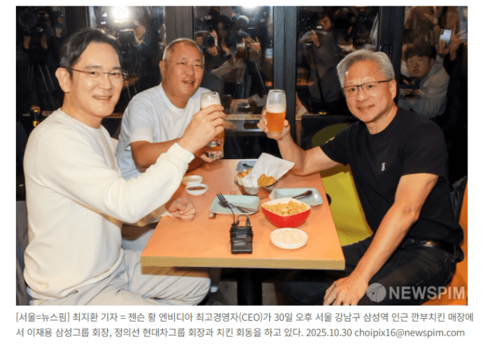 작년 10월 30일 삼성그룹 이재용 회장, 정의선 현대차그룹 회장, 그리고 젠슨 황 엔비디아 최고 경영자의 치킨 회동 기억 나시나요? 재미 삼아 치킨 회동 날로부터 지금까지 3개 회사의 주가 변화를 정리해 보았습니다.