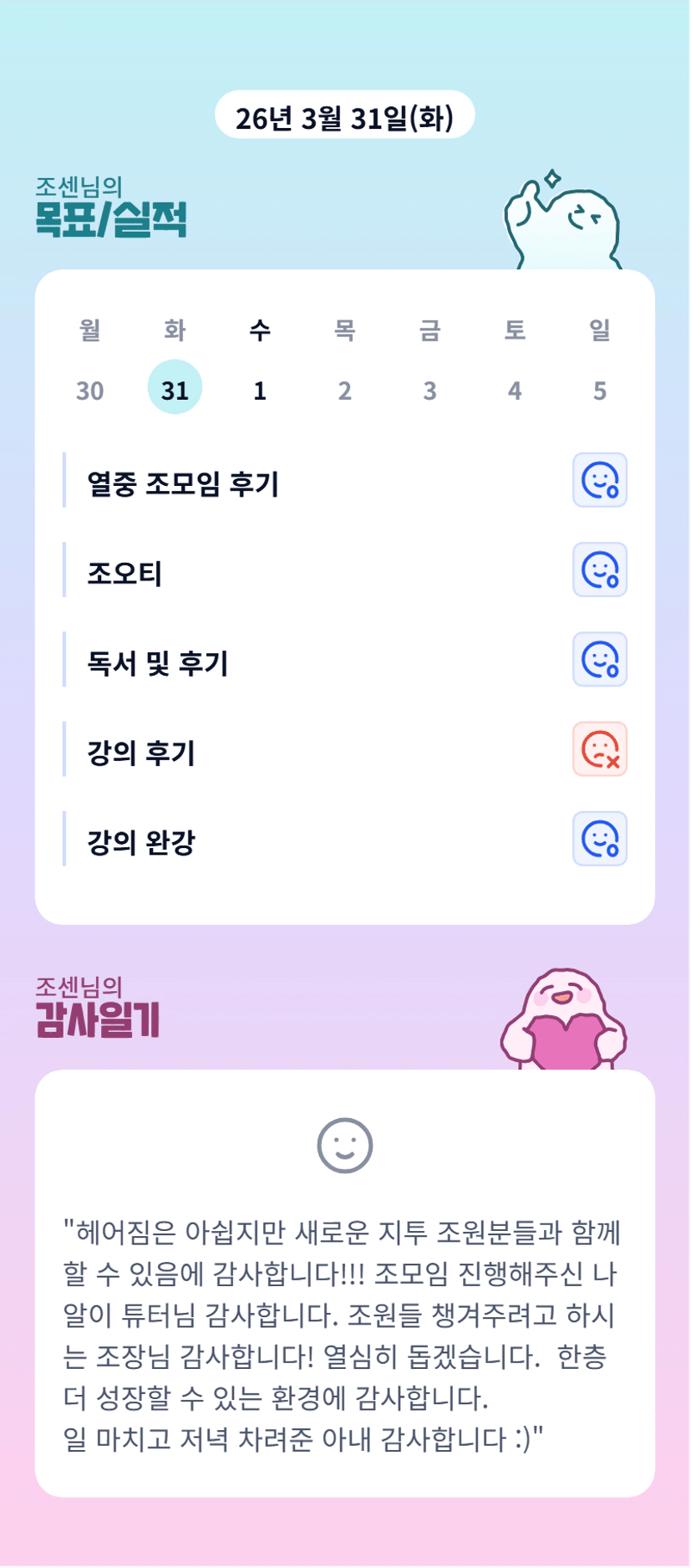 열중 다독왕! 센님 고생하셨어요 ㅎㅎㅎ 바로 양식바꿔주는 센스도 믓지당 ♥ 한달 잘 부타드려요 우리 임장팀장님!