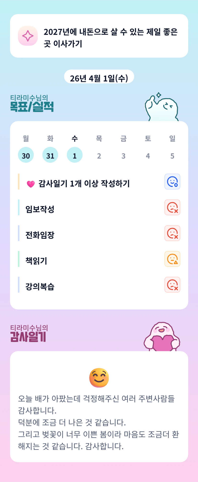 오~ 티라미수님 멋져요~^^ 이번 한 달 함께 파이팅 해 보아요😘🥰😍