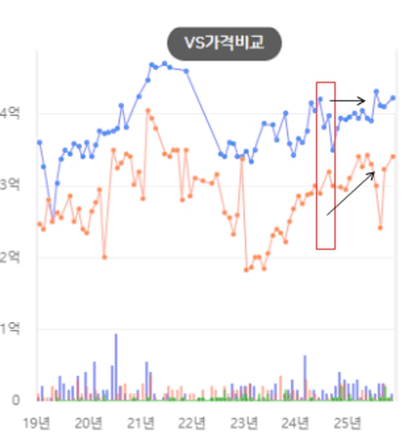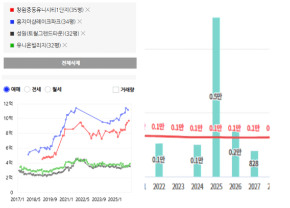 과거 2025년 과공급이었던 창원의 경우 대장급 단지들은 과공급이 끝나고 매매가를 회복한 반면 구축단지들은 아직도 매매가를 회복하지 못하고 있다.