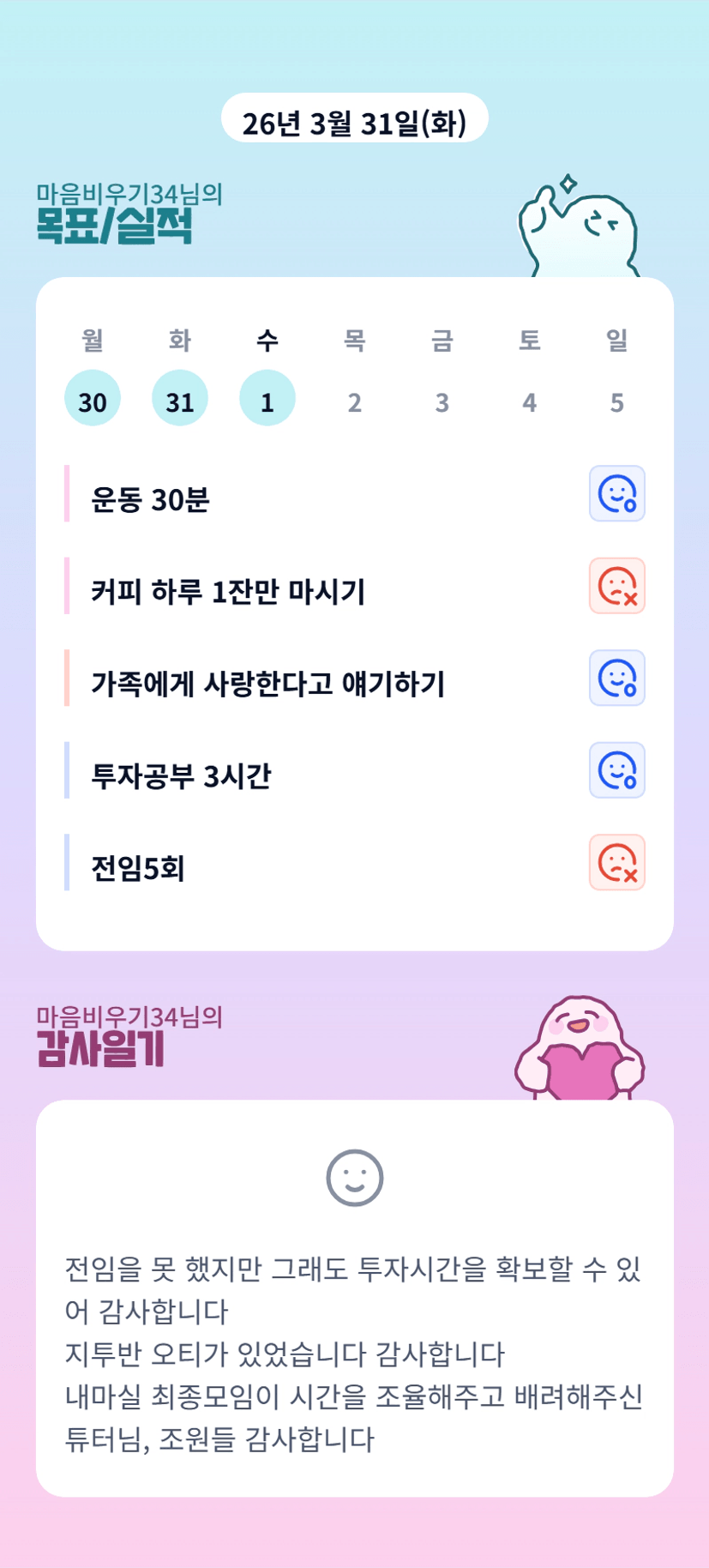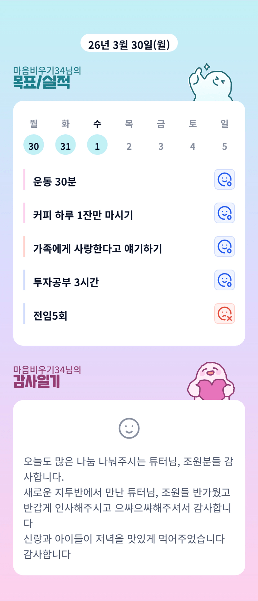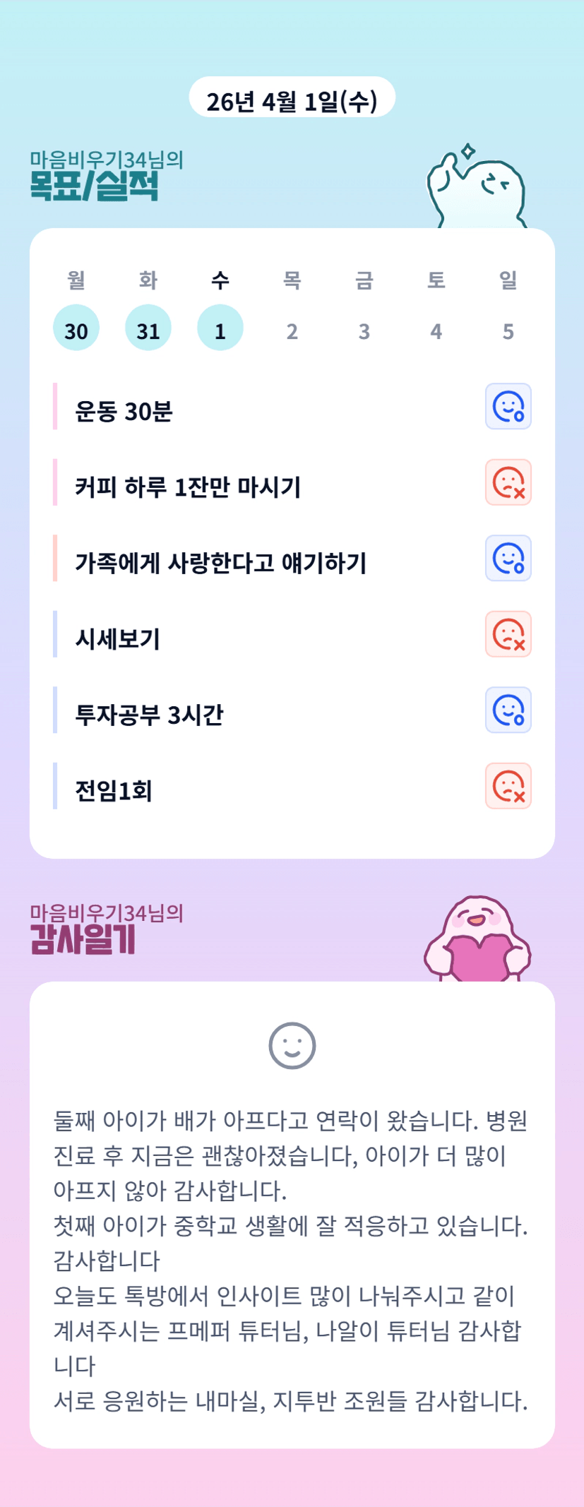 내마실 오늘이 마지막이죠? 끝까지 마무리 잘 하셔용 ㅎㅎ 아이가 아파서 마음이 아프시겠어요 ㅜㅜ 언능 쾌차하길 기도할꼐요!
