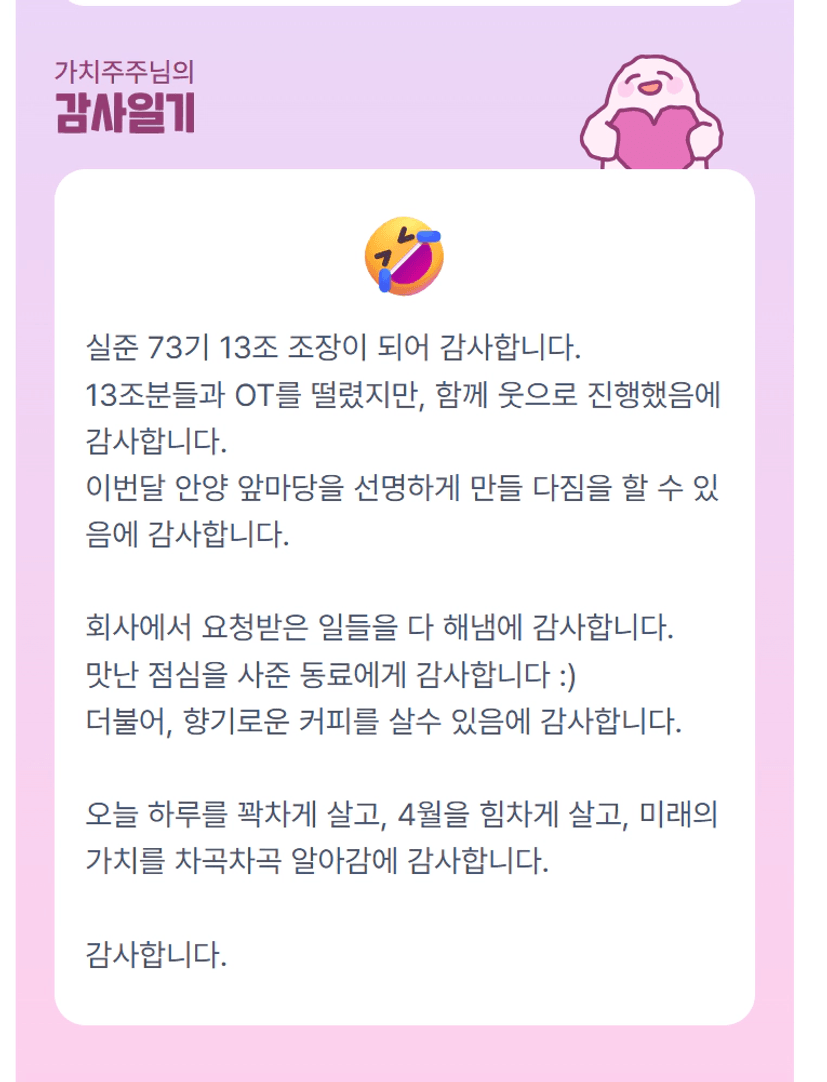 조장님 오늘 하루 오티 준비하시고, 조율해 주셔서 감사합니다. ! 한 달 동안 재미있게 배우고 함께 성장해 보아요 !