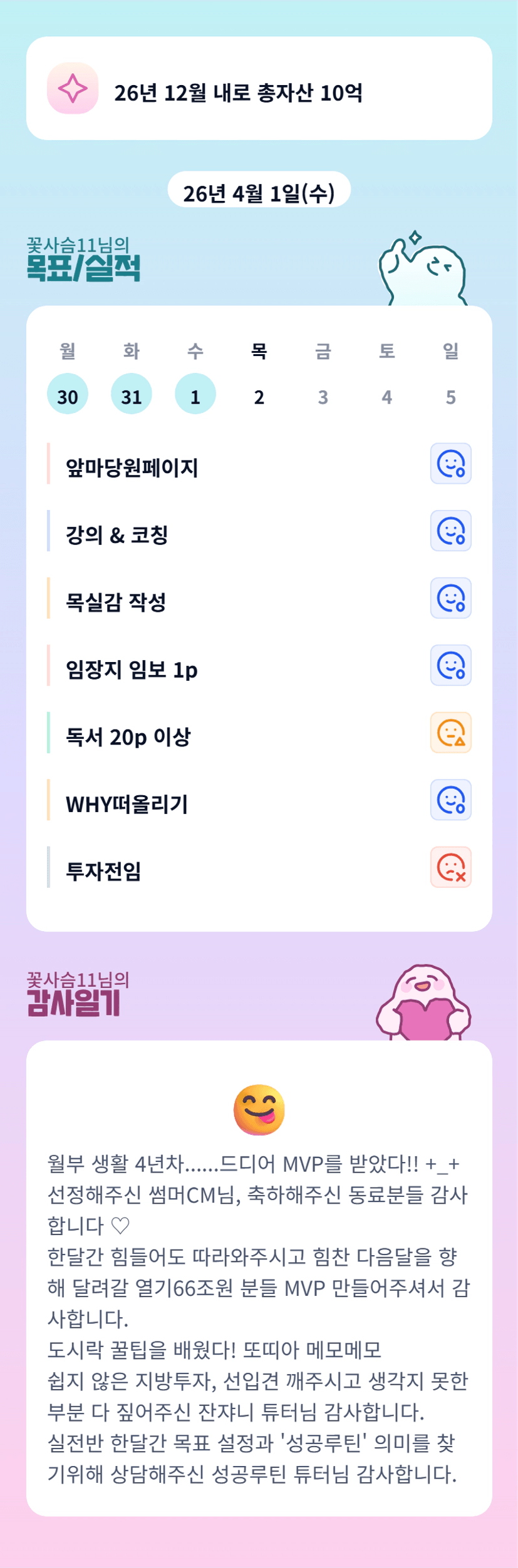 와우 사슴님...! 월부생활 4년차, 슨배님 이셨군요ㅎㅎㅎ어쩐지 아우라가 남달랐습니다 엠비피 다시 축하드리고 오늘도 고생하셨어요!