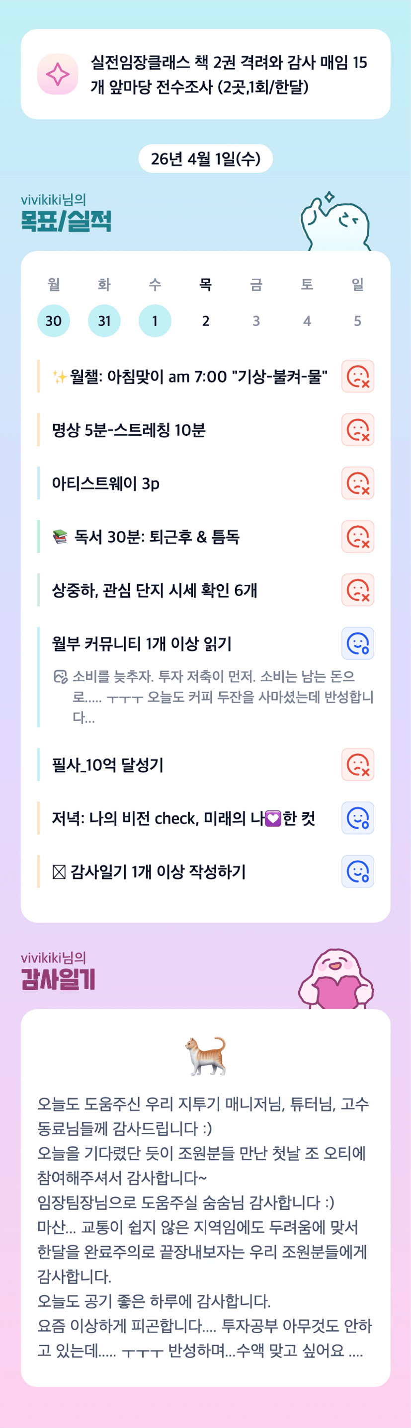 4월이 되었으니 목표를 수정해야겠다. 책은 1권읽고, 격려와 감사 진행 완료, 매임&전수조사는 … 분발하자.