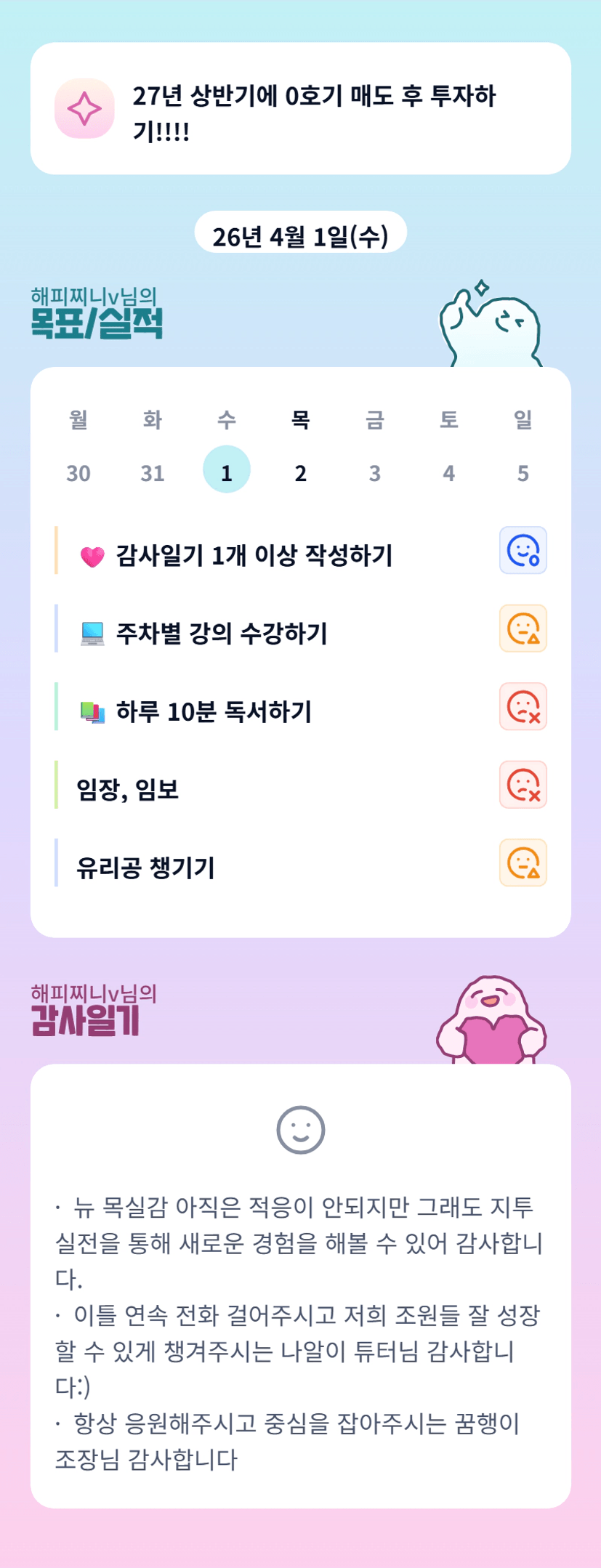 찌니님 감동~ 처음이라 어색할지 모르지만! 그래도 새로운 시도를 하고 해내었다는데 의미를 두면 정말 좋을것 같아요! 오늘도 너무 고생하셨고 목표한 강의량 채우고 자기~ 약소옥! ㅎㅎ