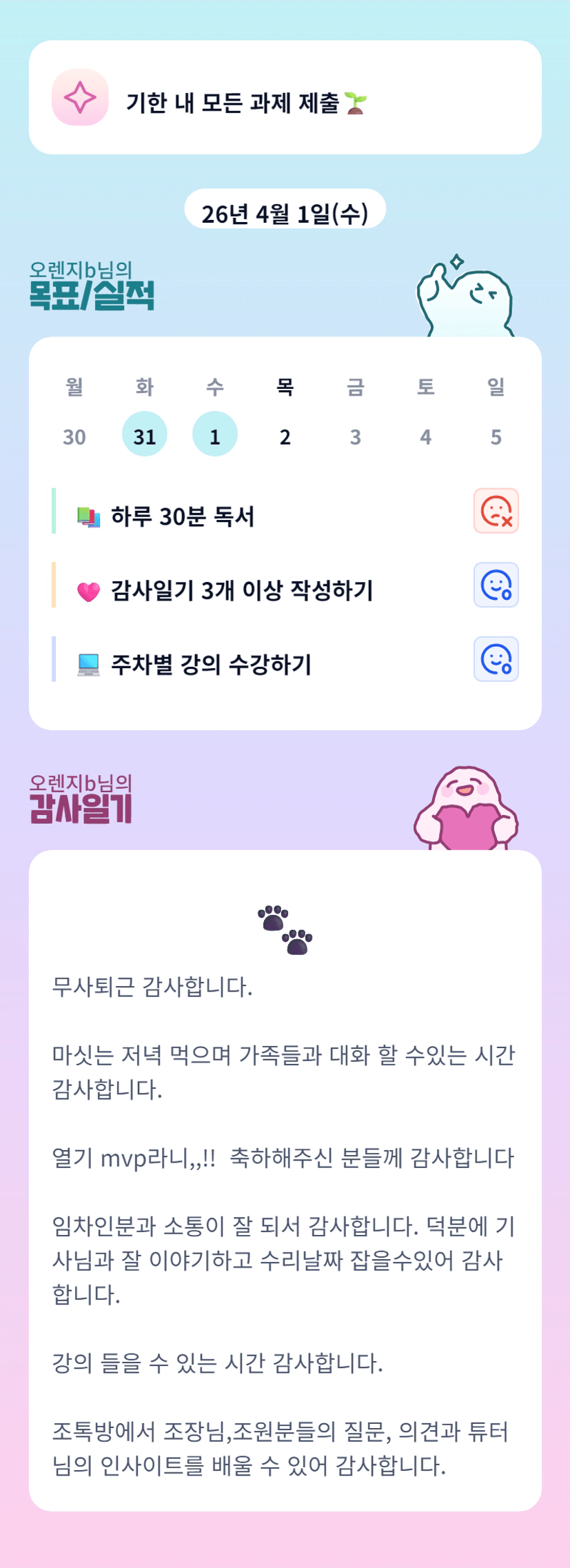 오렌지 조장님 열기 MVP 축하드립니다!!!! 실전반도 빠이팅입니다ㅎㅎ