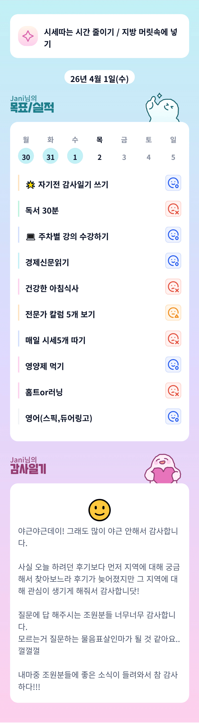 아이구야, 야근도 하시는군요ㅠㅠ 야근에 지방 임장까지 하시려면 건강 잘 챙기셔야겠어요~^^ 쟈니님, 화이팅~!!