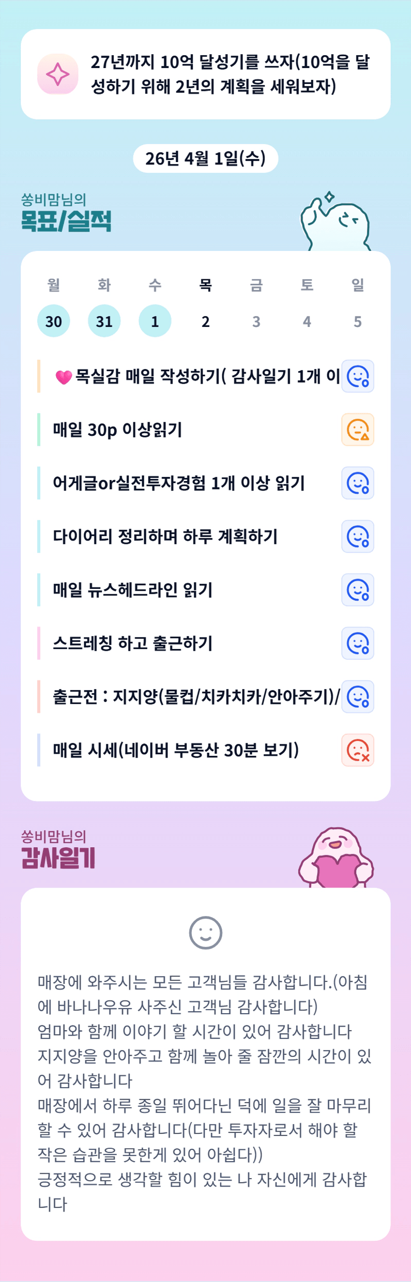바쁜 일과로 수고 많으셨습니다. 오늘도 루틴을 항해 홧팅♡