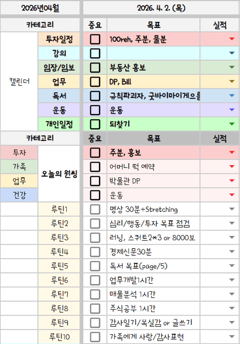 아침에 계획을 세우고 저녁에 복기를 합니다.