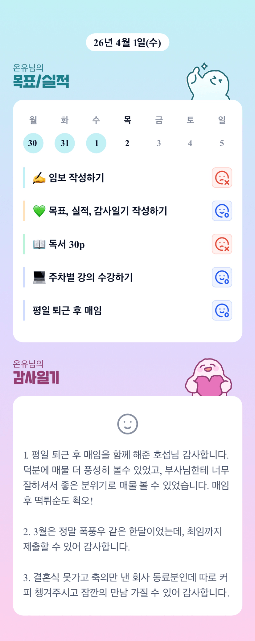 빡빡한 일정 마지막까지 매임과 최임 제출까지 정말 수고 많으셨습니다! 4월도 함께 홧팅~~^^