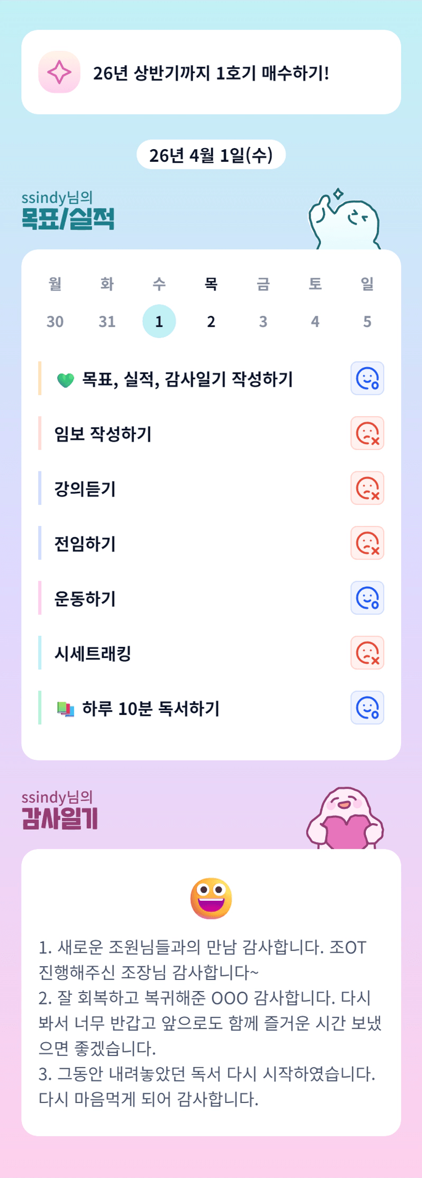 씬디님 반갑습니다~ 독서와 운동 같이 화이팅입니다! ㅎㅎ 잘 부탁드리겠습니다~!