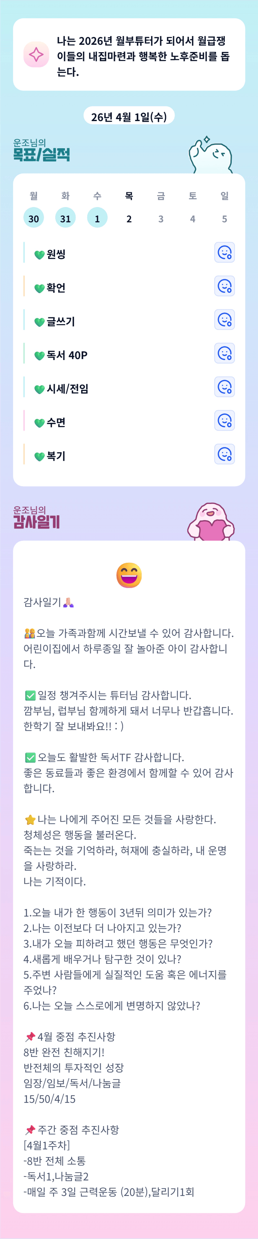 힘들어하는 동료들을 돕고, 때로는 함께 웃고 또 함께 울면서 해나가려고 합니다.