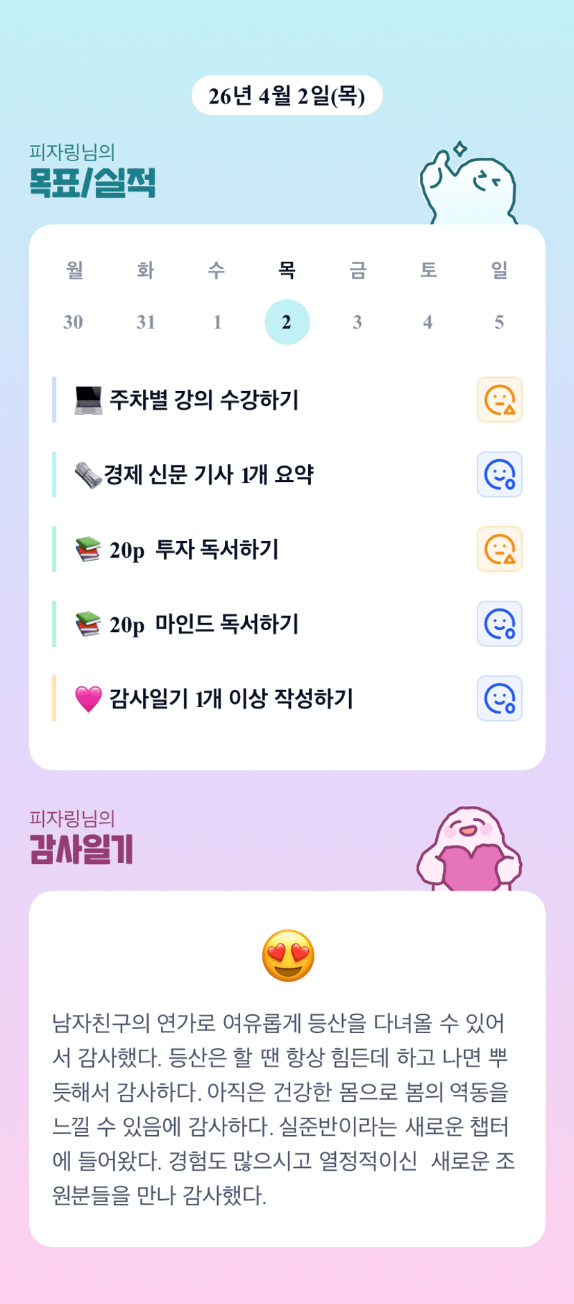 어제 등산까지 다녀오셨군요!!👍👍 피자링님 이번달도 같이 화이팅해요~~