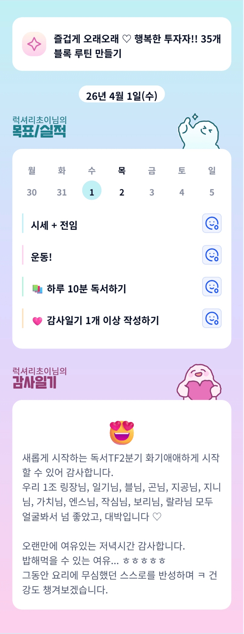 ㅋㅋㅋㅋㅋ또 다시 같은 조가되어 넘나좋습니다 초이님 3개월동안 잘부탁드려요❤️