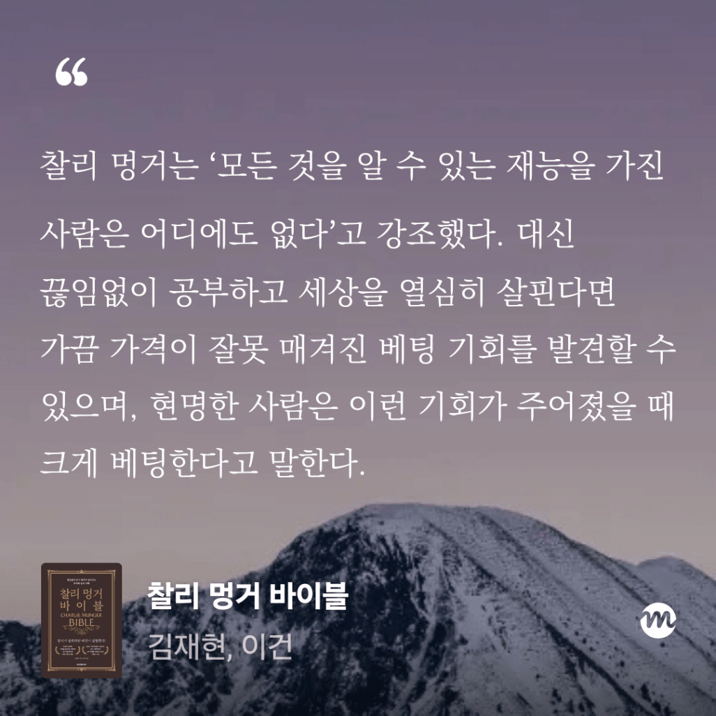 “끊임없이 공부하고 세상을 열심히 살핀다면 가끔 가격이 잘못 매겨진 베팅 기회를 발견할수 있고, 현명한 사람은 이런 기회가 주어졌을 때 크게 베팅한다.”
