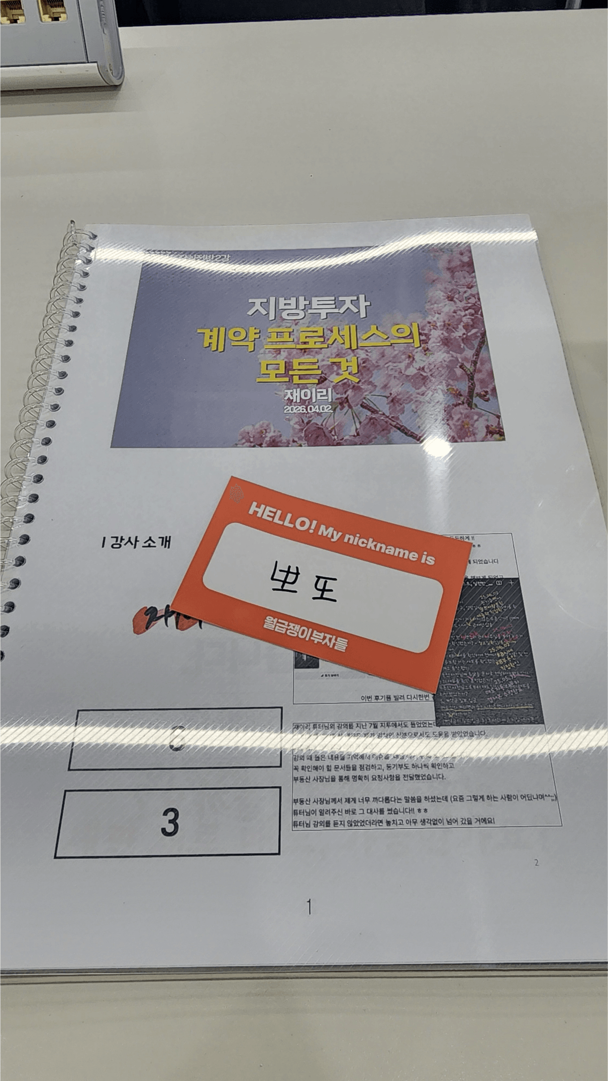 전반적인 계약 프로세스를 배웠는데 제가 했던 1호기가 떠오르면서 이 강의를 1호기 전에 들었으면 너무 좋았겠다는 생각이 들었어요. 매수할 마음은 먹었는데 그 뒤 가계약부터 뭐가 뭔지를 몰라서 월부 후기들을 뒤지고 조장님과 친구들에게 엄청 질문을 많이 했던게 생각납니다. 여기에 그때 고민했던 모든 답들이 들어있었어요. 매수, 전세, 보유, 매도 프로세스를 아주 자세하게 케이스 별로 설명들을 수 있었어요. 이번 강의 교안은 다음 매수때에도 뒤적여보겠구나 싶었습니다.