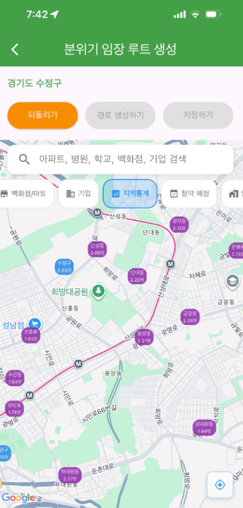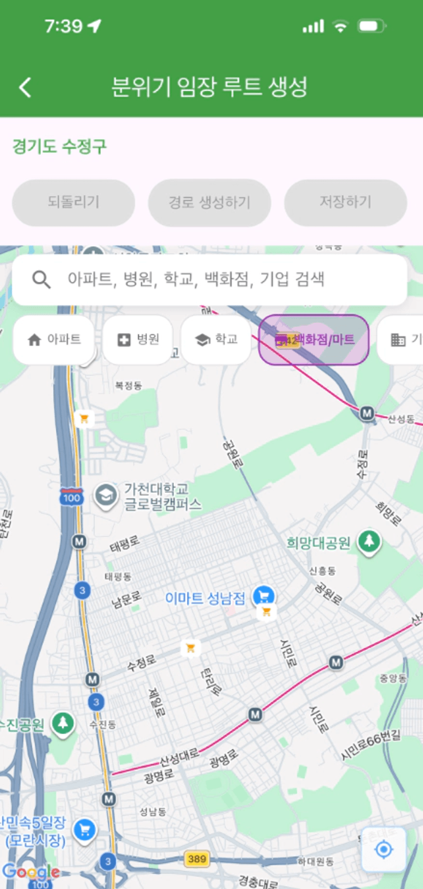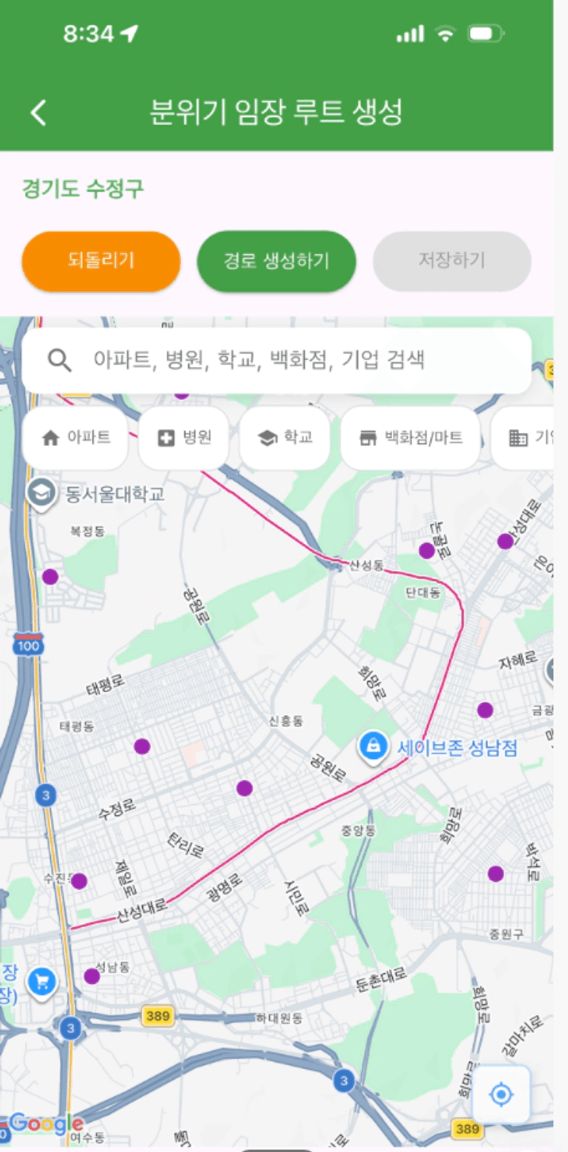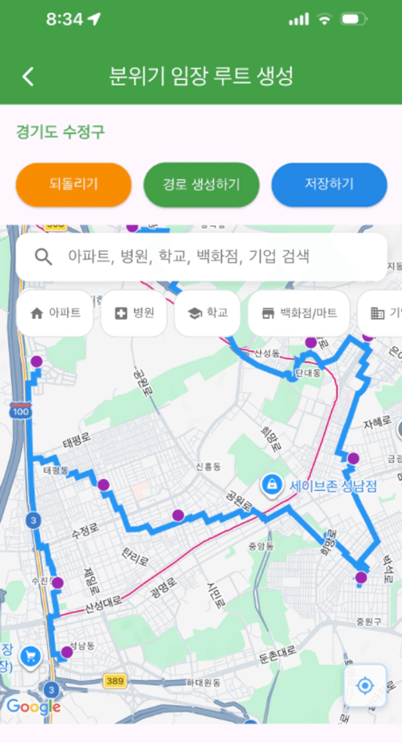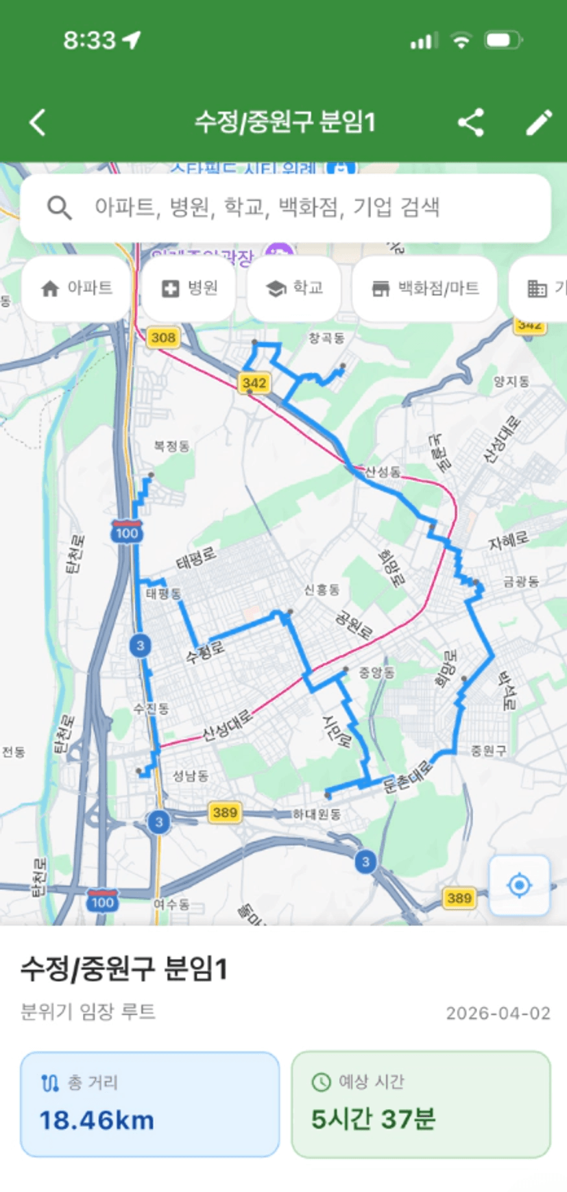 저희 조는 중원구도 같이 임장하자고 의견이 모여져서 수정구, 중원구 루트를 한번에 그려봤어요!