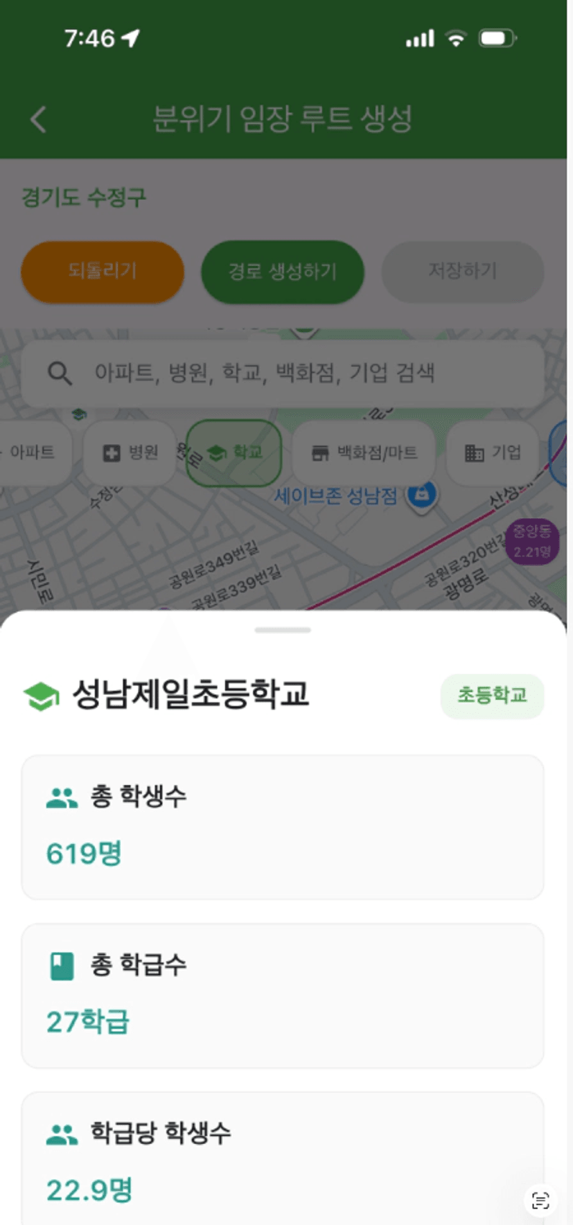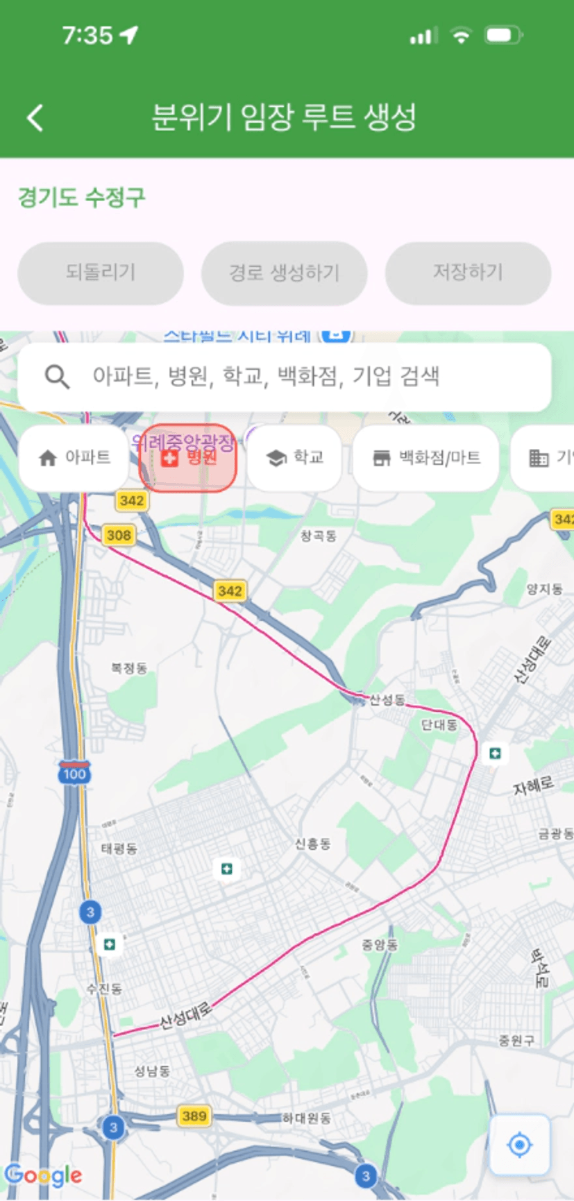 (지도 위에 있는 병원, 학교 같은 토글을 눌러서 켜면 마커들이 나옵니다!)