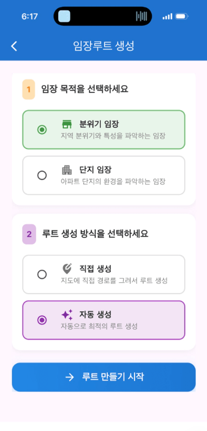 먼저 임장루트 탭에서 임장루트 생성으로 들어갑니다.