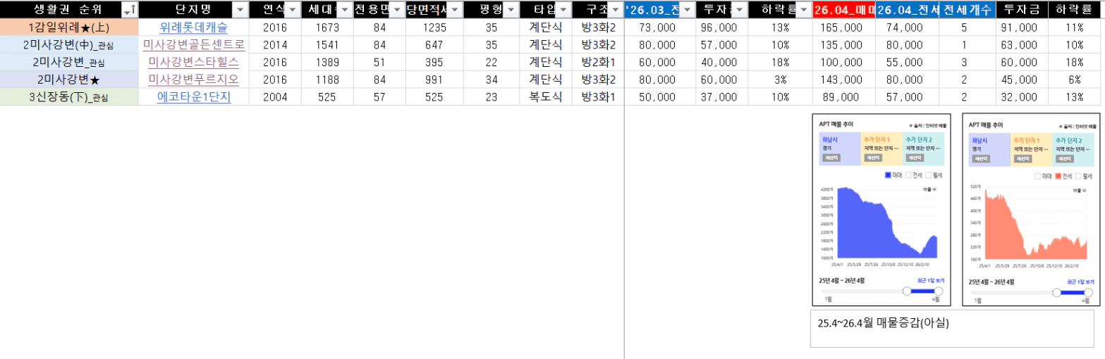 추가 항목: 전세 개수, 매물 증감(아실), 해당면적 세대수