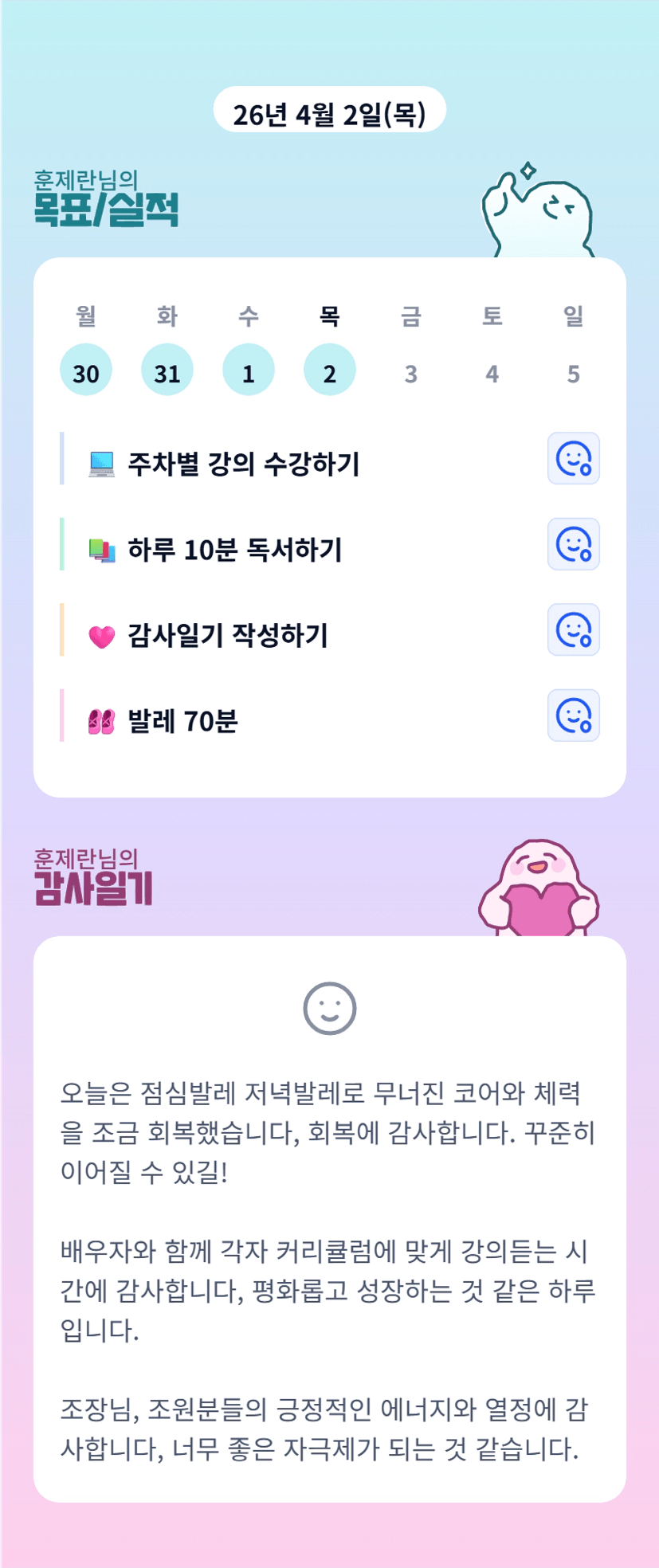 오~ 훈제란님^^ 강의와 조모임 열심히 하시는 모습 넘 보기 좋네요ㅎㅎ 내마기 홧팅입니다~!!
