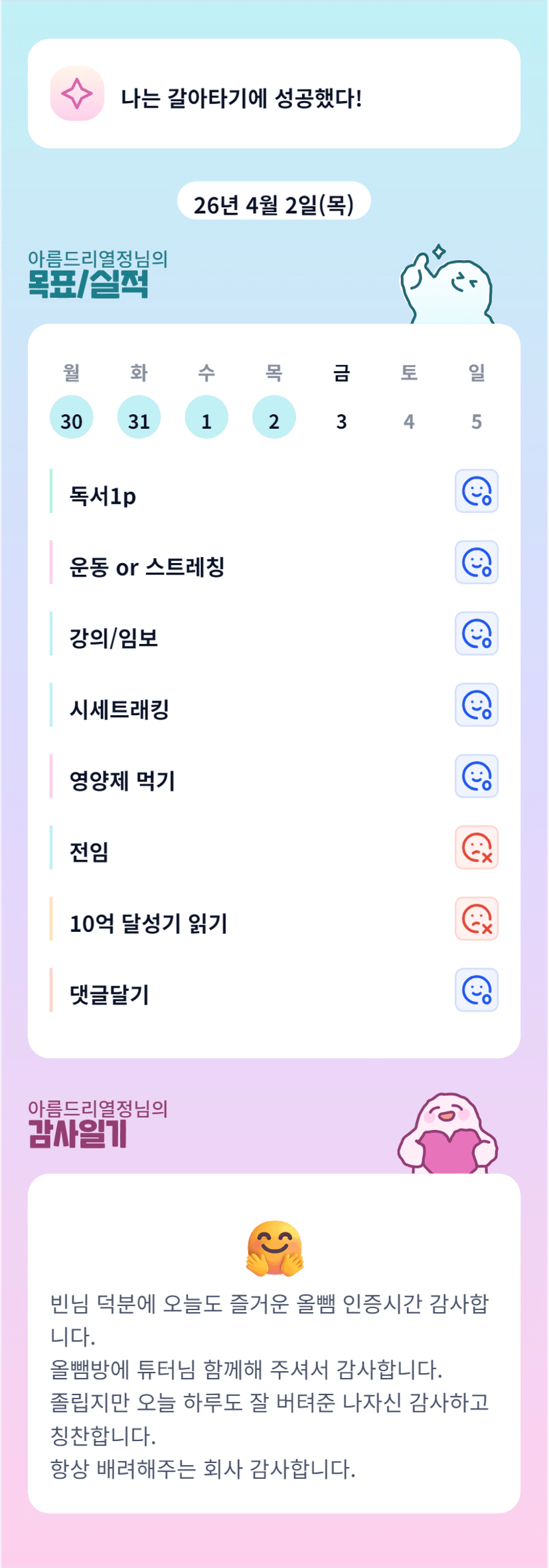 ㅎㅎ 요즘 날씨가 따뜻해지니까 점심 먹고 많이 졸립더라구요 ㅎㅎ!! 닉네임처럼 항상 열정적인 모습 보여주셔서 자극이 많이 됩니다 ㅎ 오늘 하루도 파이팅!입니다.