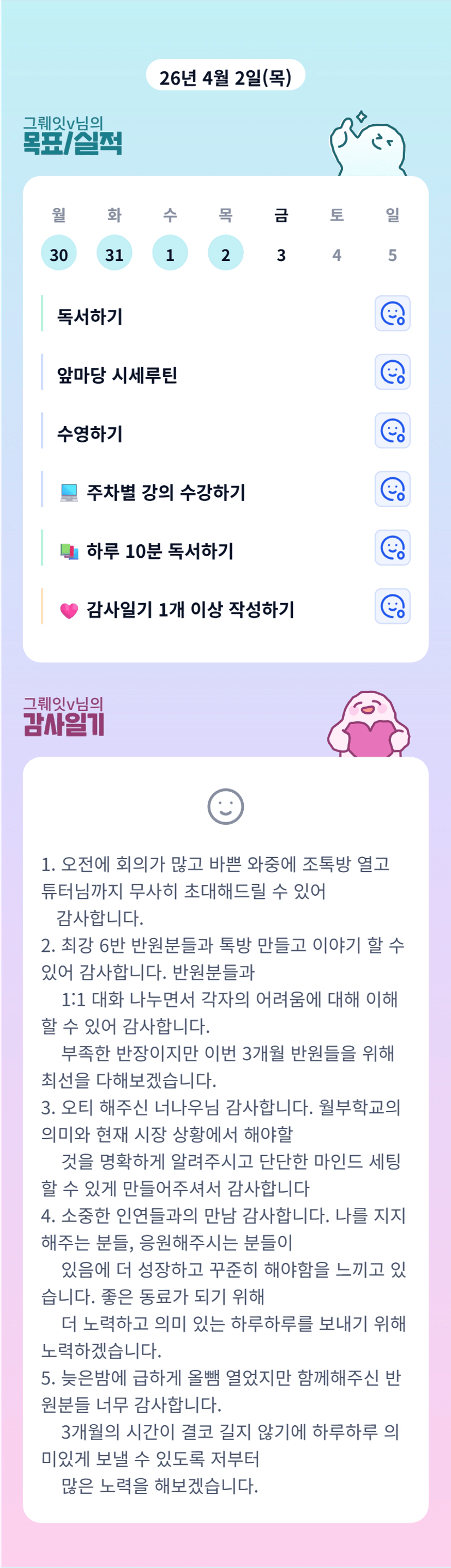 반장님 벌써 기버의 향이 낭낭해서 함께 하는 시간이 행복할 듯 합니다 🌸 반장님 시간관리 너무 귱금해지는 목실감이네요! 오늘 하루도 행복하세요!