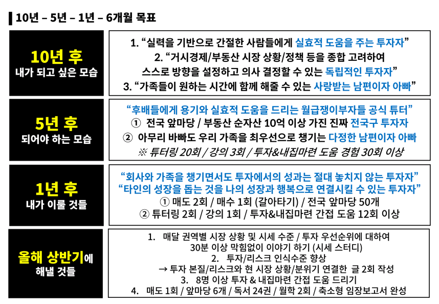 타인을 돕기 위해서는 저 스스로가 먼저 시간 확보가 되어야 하기 때문에 임장보고서나 후기, 강의계획서 등 제출기한이 있다면 촉박한 경우를 제외하고는 웬만하면 하루이틀 먼저 완성하는 것을 목표로 삼아 봐야겠습니다.