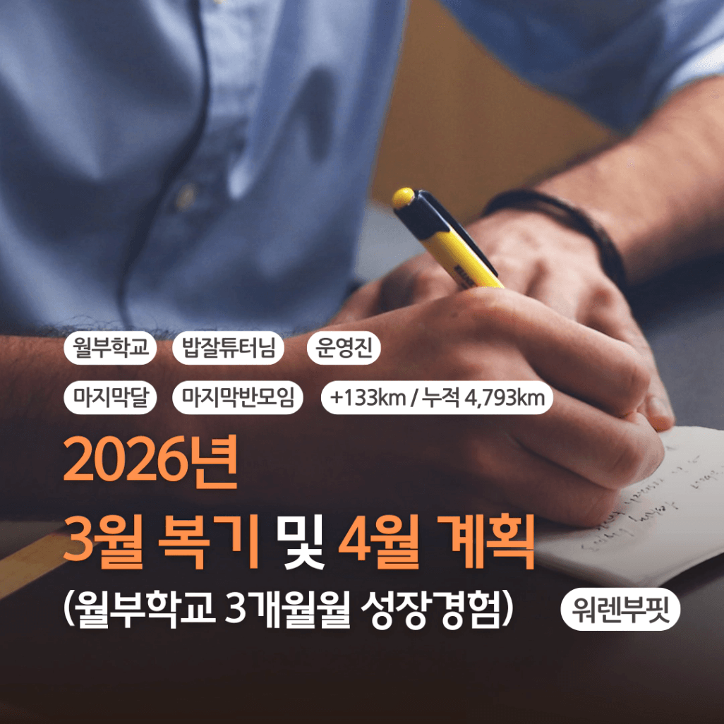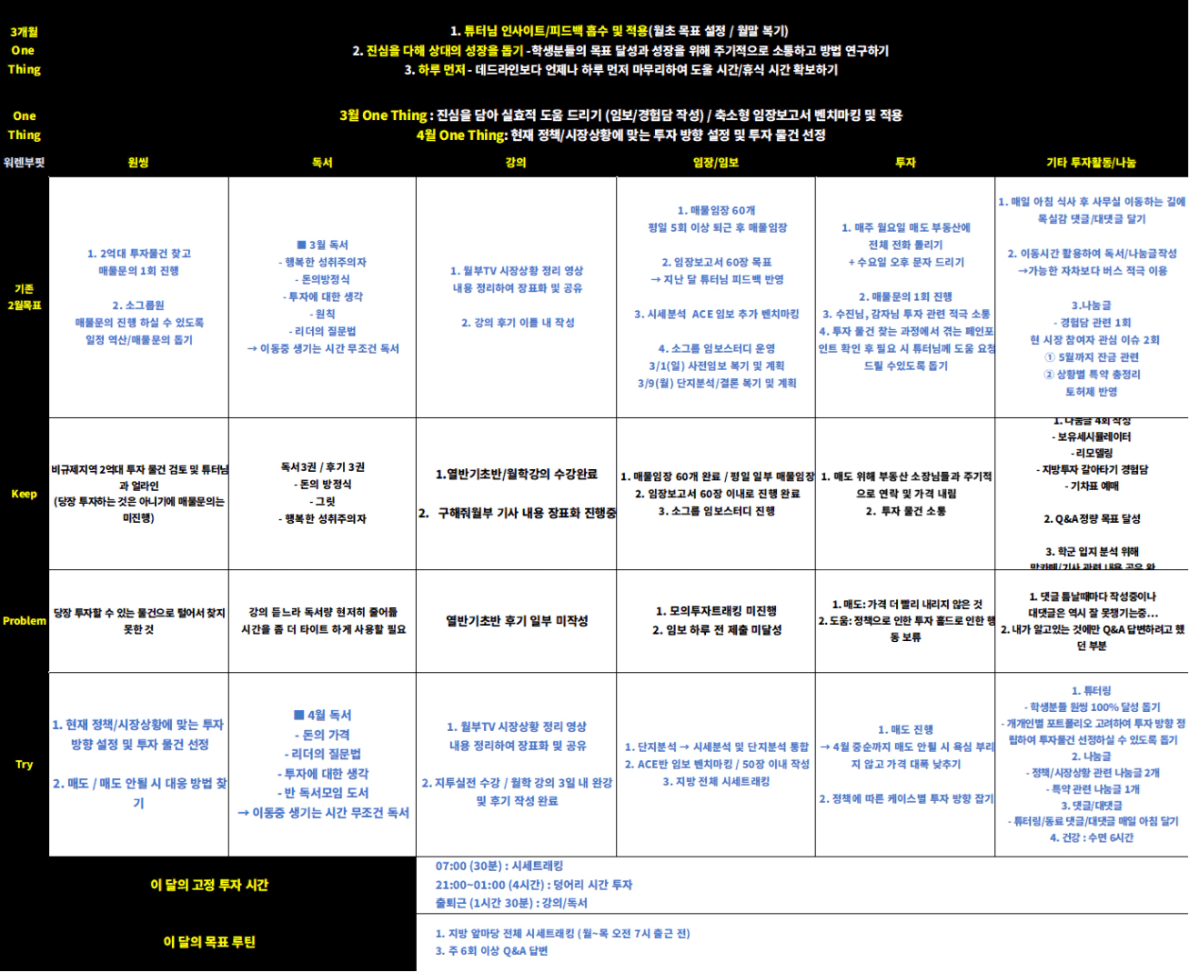 4월에는 개인적인 투자적 원씽은 챙기되, 튜터링하는 학생분들의 성장, 그리고 에이스반 동료분들과 친해지며 주니어분들의 적응도 함께 돕는것에 조금 더 집중해보자 합니다.