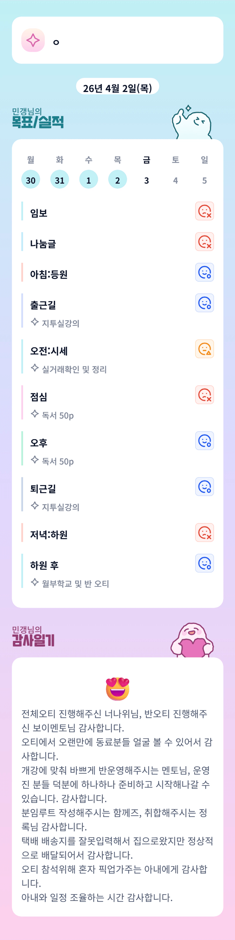 갱님 시간대별로 루틴 박아놓는거 너무 좋네요 ㅎㅎ 맛점하시고 오후도 빠이팅입니다!!💛