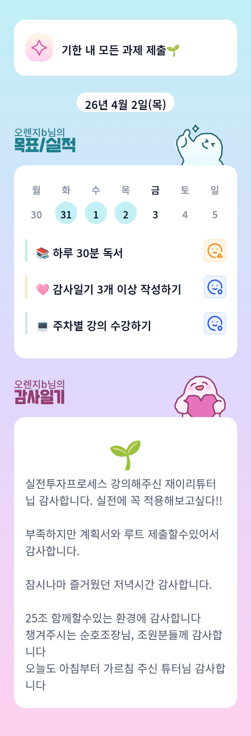 렌지님! 오프강의 들으시느라 고생많으셨어요~ 후기도 기대하겠습니다 화이팅입니다!!^^