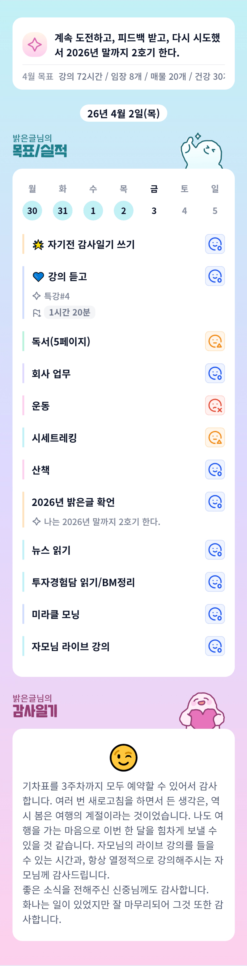 지방 가시는군요 조장님! 꾸준히 하시는 모습에 저도 힘이 납니다. 4월에도 화이팅이여요❤️💙💛🤎🧡💜🖤🩶