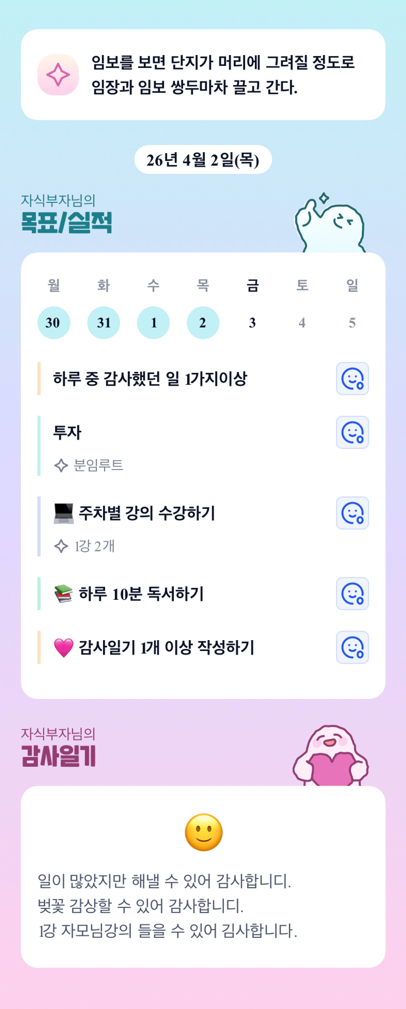 ㅎㅎ모든일을 다 완료하셧네용! 오늘도 화이팅하세요!