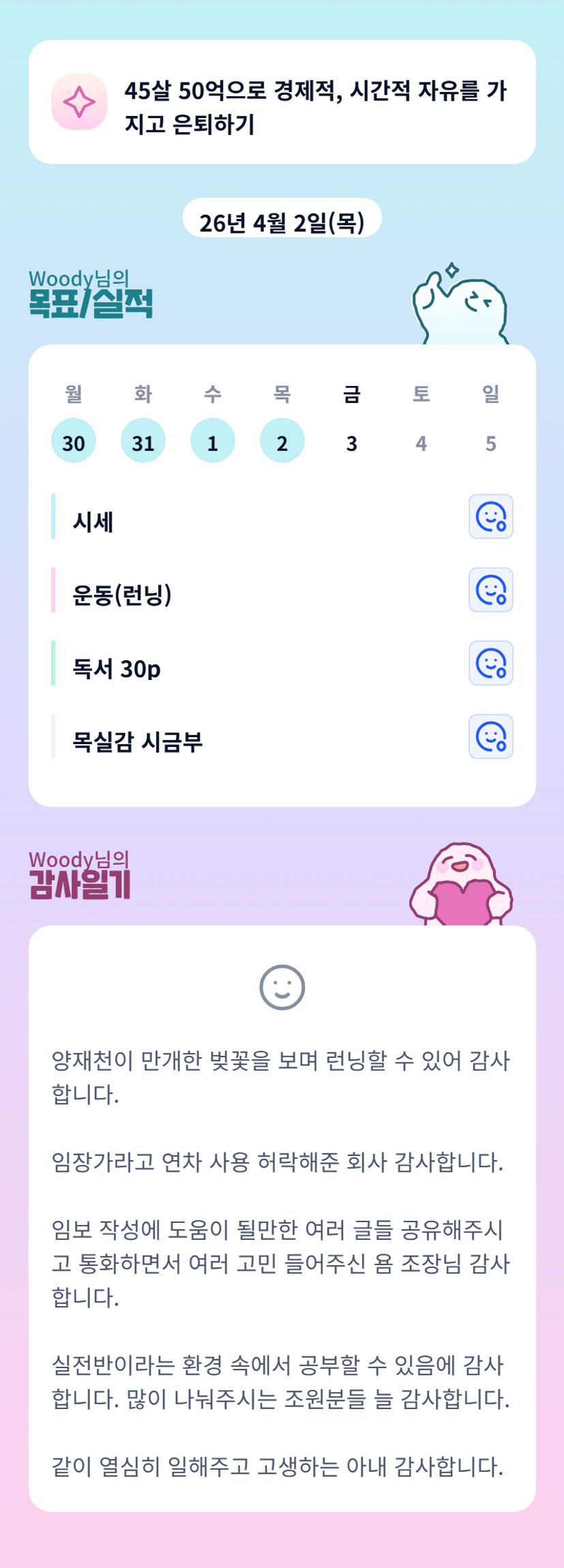 양재천 러닝 이라니~~~ 설레는 시간이었겠네요..우디님의 하루 응원합니다~!! 이번달 임장가면 특히나 우디님 생각이 많이 날듯 합니다~~^^