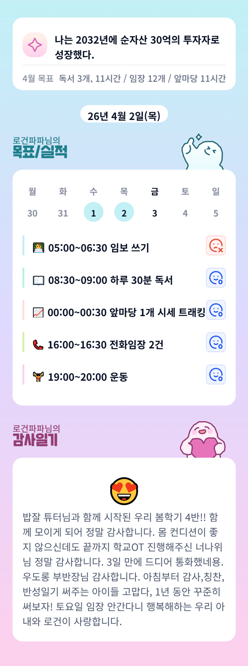 우와~!! 부반장님 시간대별로 할일 써 놓으신분은 처음 봐요~!! 저는 할일 리스트인데 시간까지 있으니 루틴 느낌이네요~