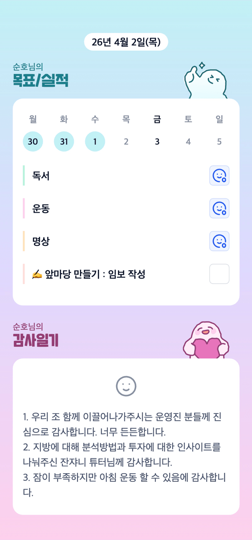 아침운동이요? 와... 조장님... 엄청난 분이셨당.. 👍